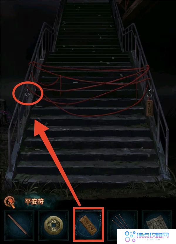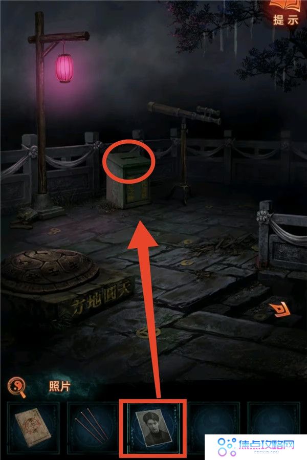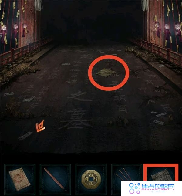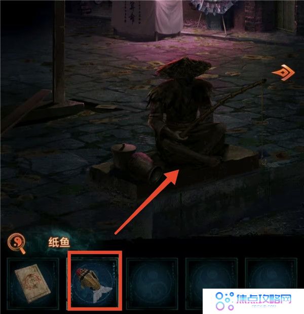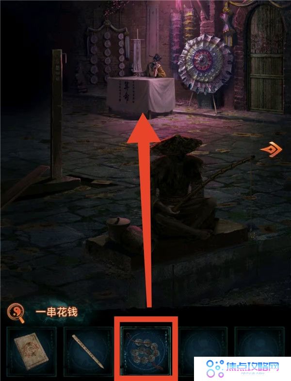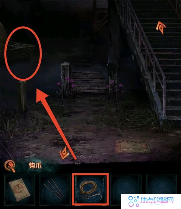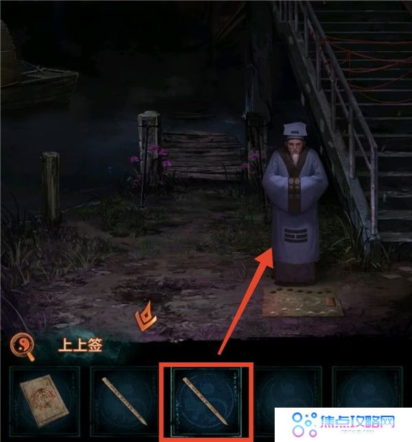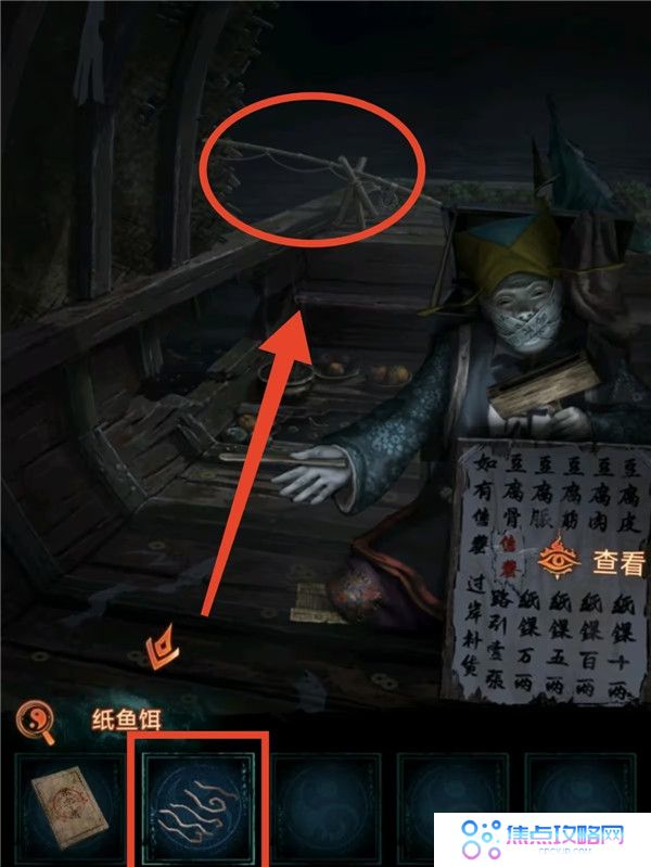 7、把遗照丢掉,看望远镜获得线索4,上桥按照线索4把人形孔明灯点亮成对应颜色,获得钩爪。去河边用钩爪把船勾过来上船,点柱香后获得纸鱼。