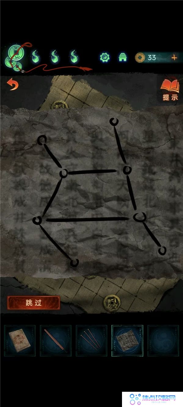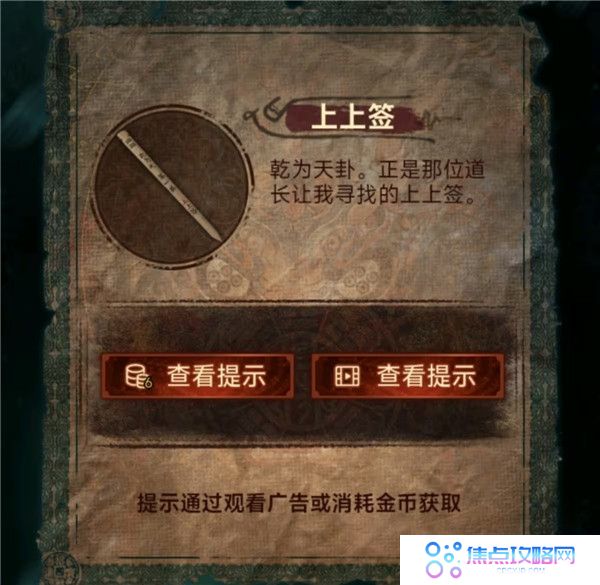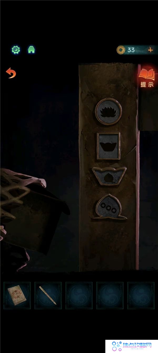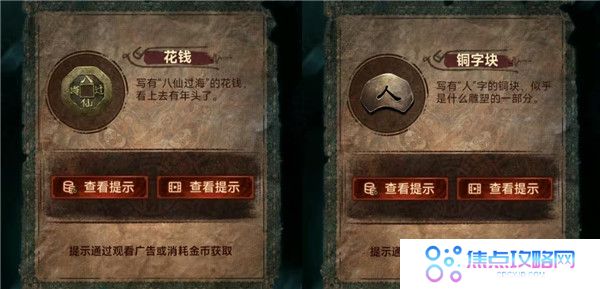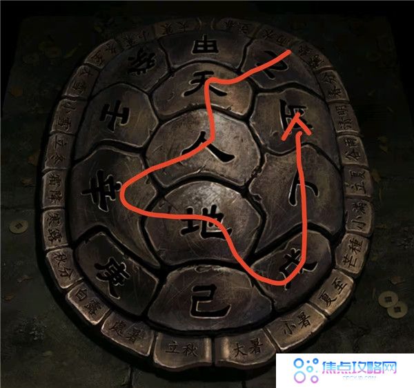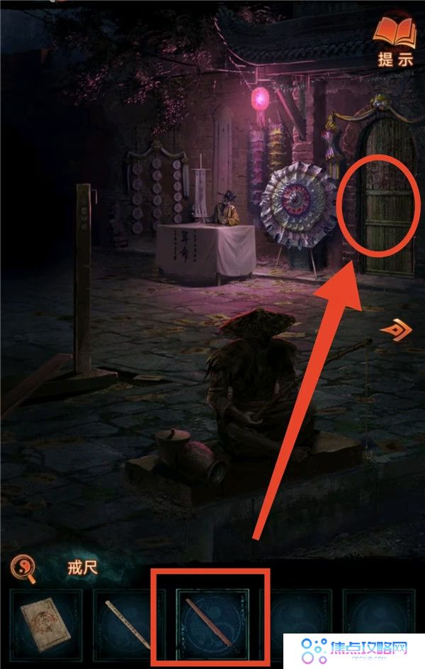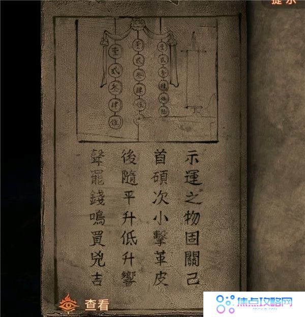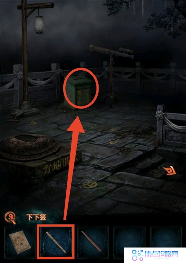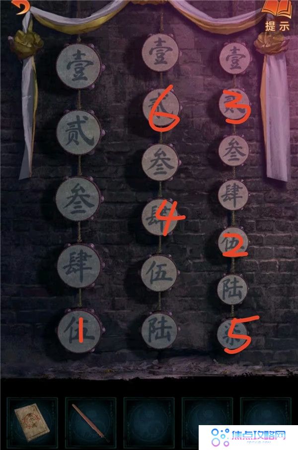 4、用戒尺开门,把下下签丢了,灯笼亮红色去望远镜获得线索3,结合书上内容按顺序(如图所示)敲打老八旁边的鼓,获得花钱和龟壳。