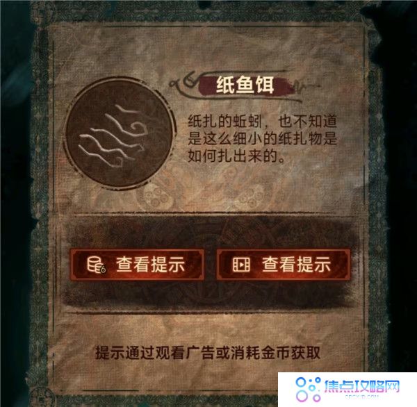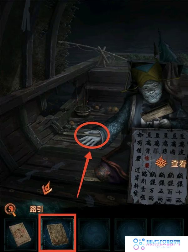 8、把纸鱼给钓鱼佬挂上,钓鱼佬会把饵料送你,上船,现在你就是钓鱼佬,不过运气不错钓上关键线索乌龟,回露台按顺序点击龟壳获得路引,把路引给老八渡娘后通关。