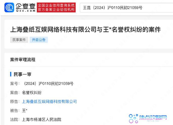 据企查查上海叠纸互娱网络科技有限公司新增一条开庭公告信息,被告为王昆(派克特本名)。预计2025年1月14日下午14:00开庭。