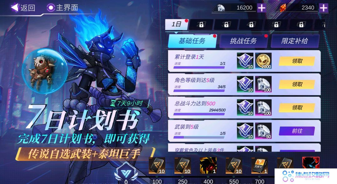 七日计划送各种十连抽,极品武装,迷你巨手,还有大奖传说自选武装;开服庆典,惊喜连连!完成对阶段可解锁相应的大奖,完成成长度奖励首周完成可得:80抽奖芯片、随机极品武装、自选传说武装、随机橙色机核卡、五星迷你巨手(武器)、8000钻石等来拿到手软哦~~