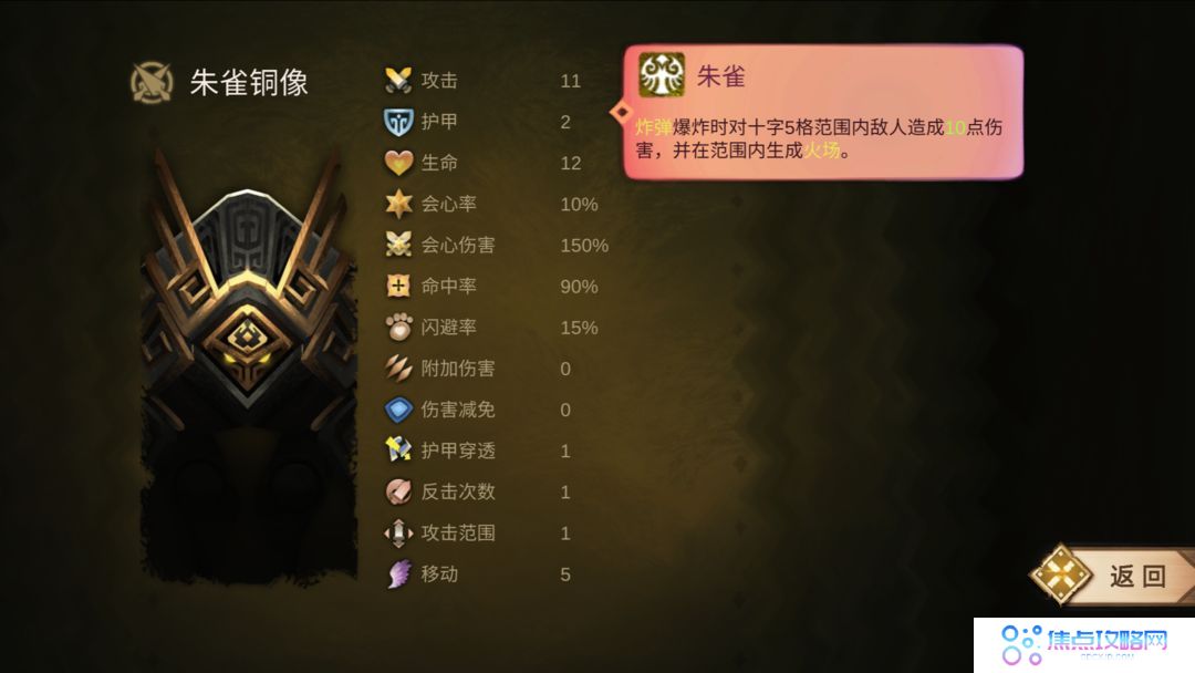 朱雀铜像由斥候+奉常组合而成,朱雀铜像可以使用高额伤害的炸弹,并且在引爆炸弹后会留下火场,灼烧残余的敌人。