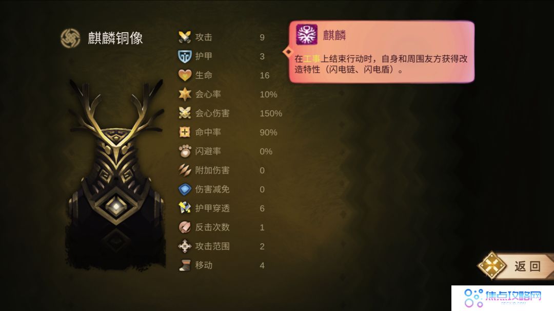 麒麟铜像由奉常+武士组合而成,麒麟铜像以辅助为主,让站在工事上的队友能够获得强力的改造特性。