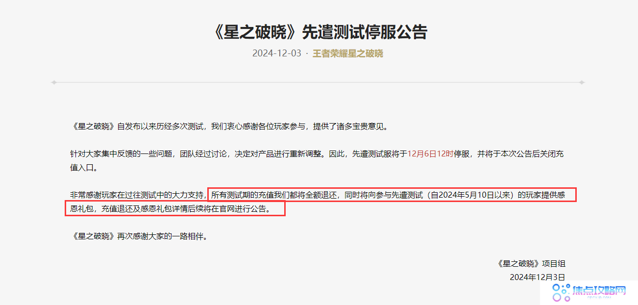 腾讯天美工作室群研发的手游《王者荣耀:星之破晓》发布了一项重要公告,宣布其先遣测试服将于12月6日12时正式停止服务,所有测试期间的充值将全额退款。这一消息引发了众多玩家和业内人士的广泛关注。