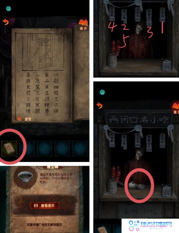 4、点击小吃店,根据《无字谶》上的线索(一敲四牲三子孙,第二第五沏楮尘,心急莫忘有冥镪),按(四牲脍、楮尘糊、子孙饭、冥镪糖、楮尘糊)的顺序点击菜单牌;触发剧情,获得【楮尘糊】