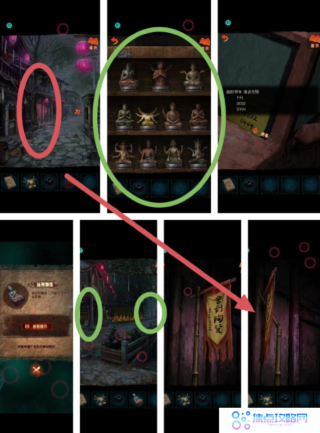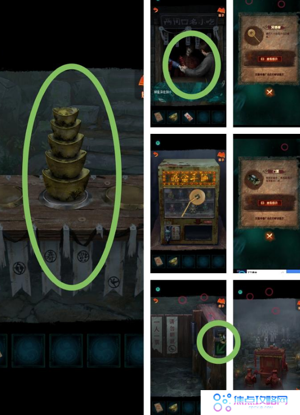 23、(魁阙关内)点击左侧怪人抬着的担子,放上【纸元宝】,完成汉诺塔小游戏;触发机关,注意布条上的图案及位置