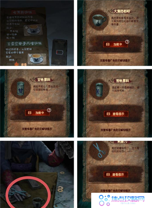 使用小物件开咖啡馆门,在吧台按菜单配方做大焦热咖啡,并获取甘味、苦味原料。