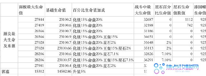 全部生命百分比加成包括:星石百分比生命值加成、升星百分比生命值加成、命盘百分比生命值加成(例:颜良两个命盘 最大生命大幅/中幅提升等)、以及队友提供的生命值加成(例:王粲队长技15%生命值,鲁肃队长技20%生命值等)